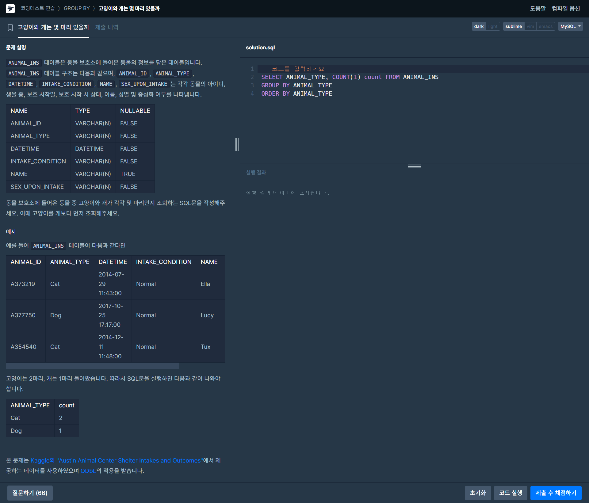 문제의 답입니다. 그냥 고양이와 강아지를 그룹별로 묶고 그 그룹에 속한 아이들의 수를 셌습니다. COUNT(1)로 했지만 COUNT(*)으로 해도 상관없습니다.