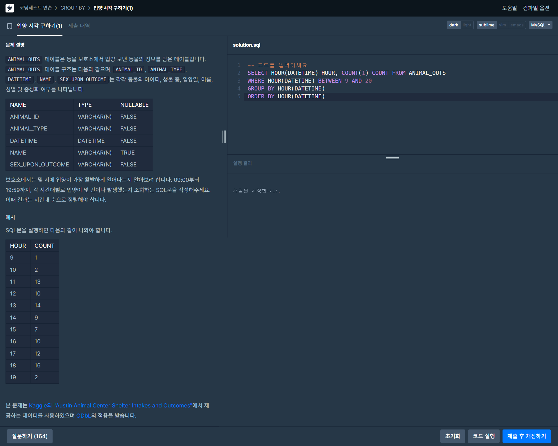 저희는 예시를 보면 시간 하나만 필요하여 HOUR(DATETIME)만 적었습니다. 여기에 추가로 09:00~19:59까지 표현하는 거니 09시부터 20시 사이를 BETWEEN을 통해 WHERE 조건을 달아서 완성했습니다. 그룹과 정렬도 SELECT에 적어놓은 것과 똑같게 해야 오류가 발생하지 않습니다.