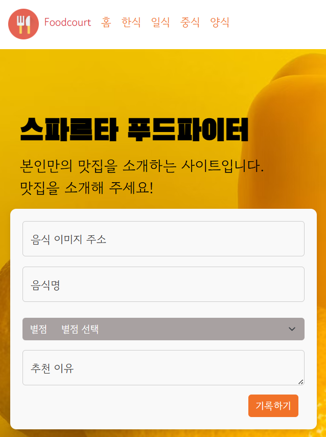 위 입력폼에 음식 이미지, 음식명, 별점, 추천 이유를 누르면 DB에 데이터가 저장되고, 이를 다시 가져와서 아래에 카드를 만드는 숙제입니다. 근데 의도한건지 아닌지는 모르겠지만 코드에 장난질을 쳐놓은거 같습니다.
