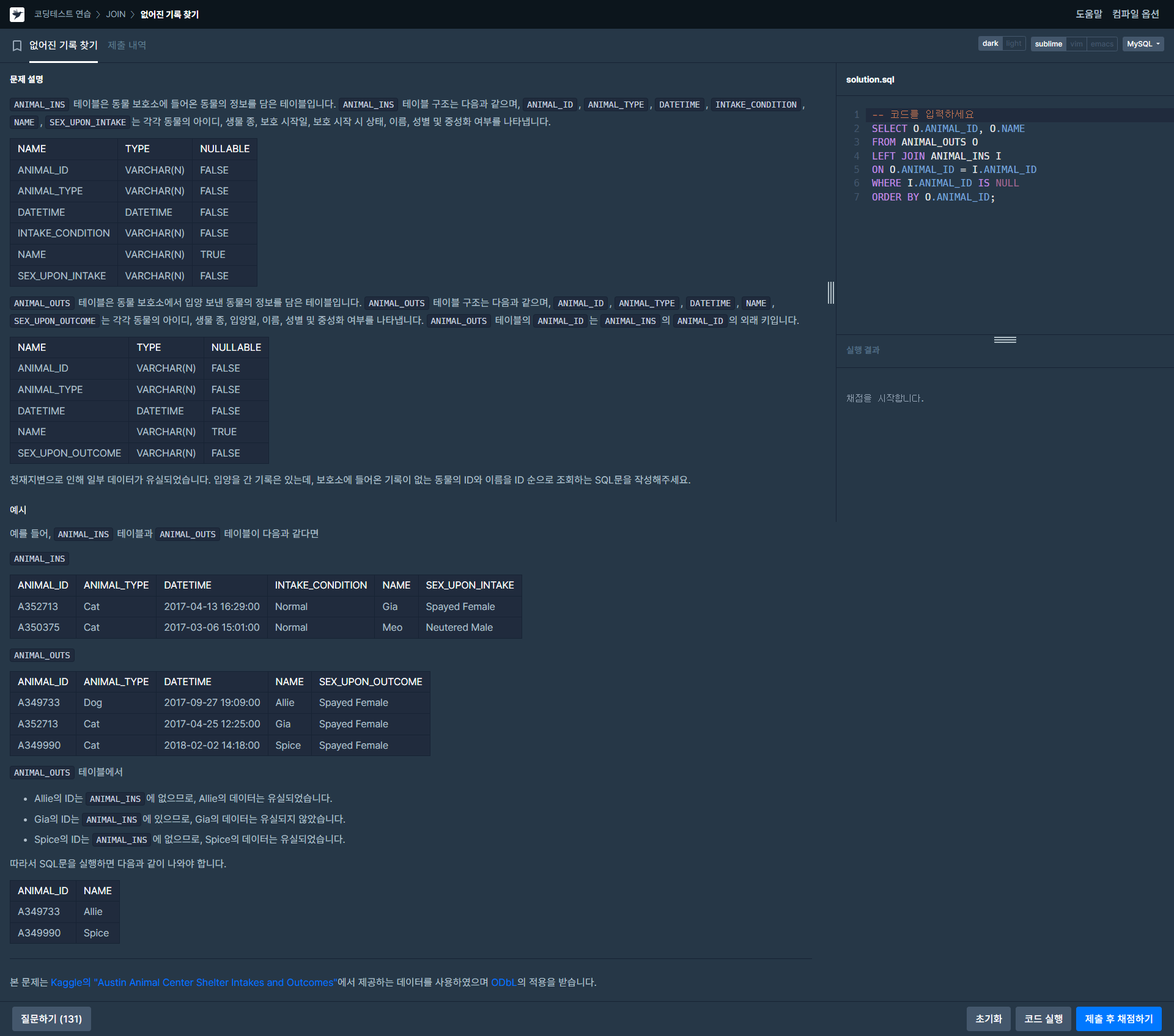 MySQL 없어진 기록 찾기 정답입니다.