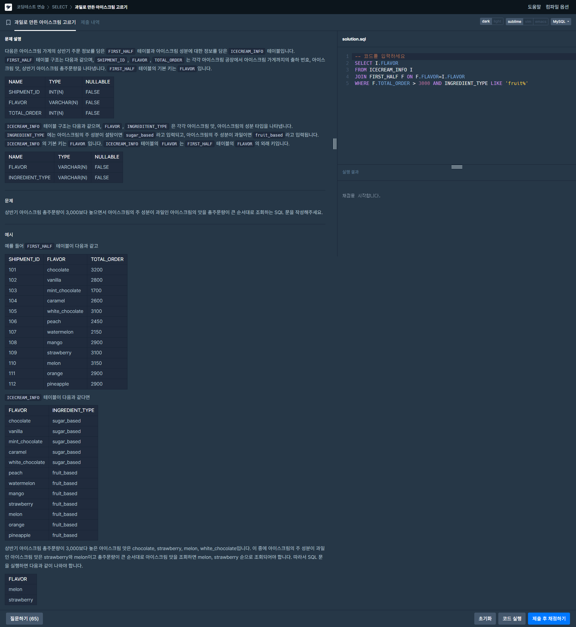 MySQL 과일로 만든 아이스크림 고르기 정답입니다.