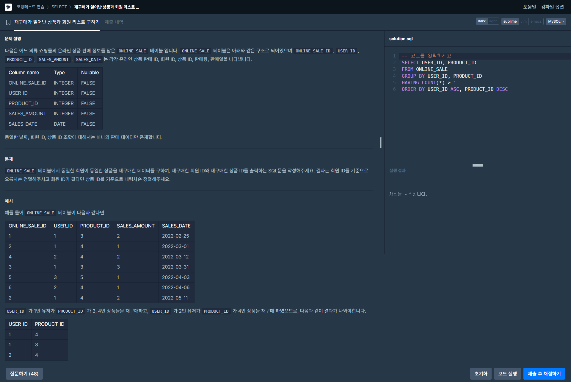 MySQL 재구매가 일어난 상품과 회원 리스트 구하기 정답입니다.