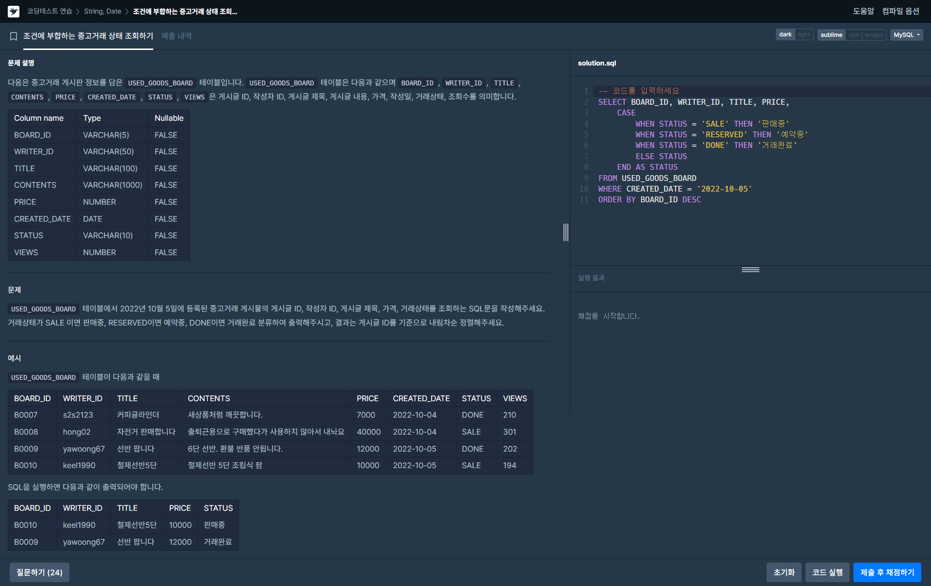 MySQL 조건에 부합하는 중고거래 상태 조회하기 정답입니다.