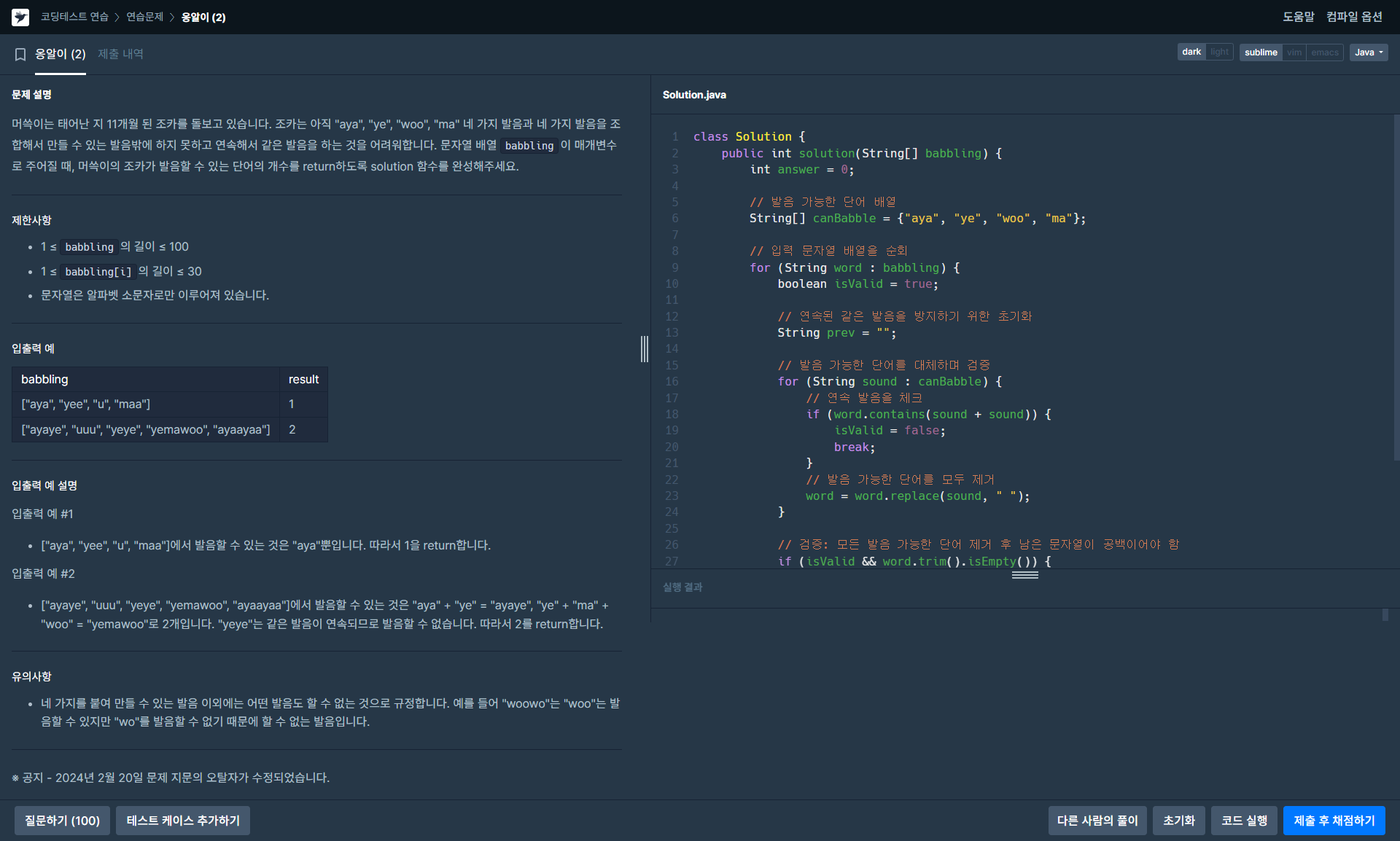 Java 옹알이 (2) 정답입니다.