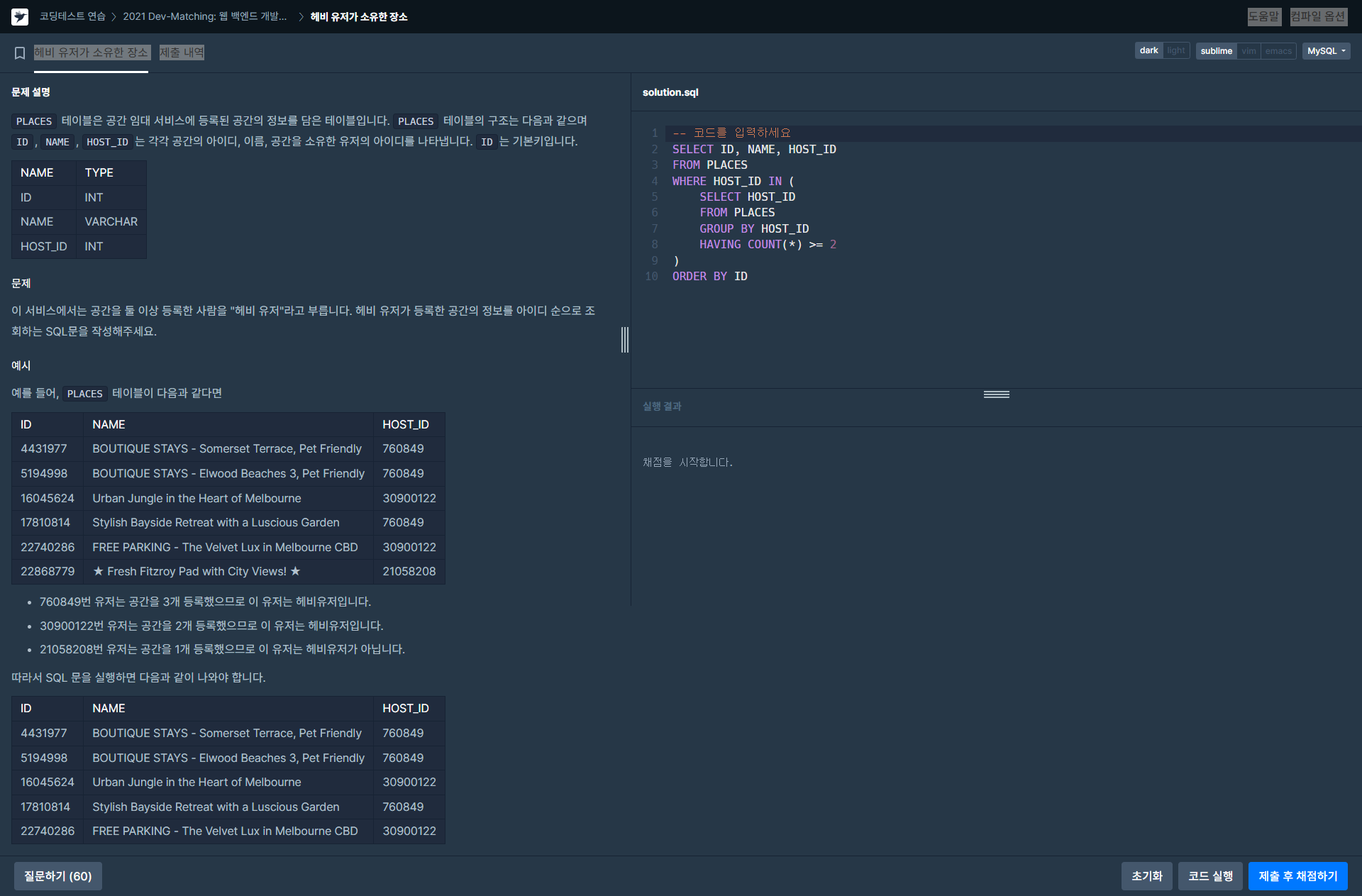 MySQL 헤비 유저가 소유한 장소 정답입니다.