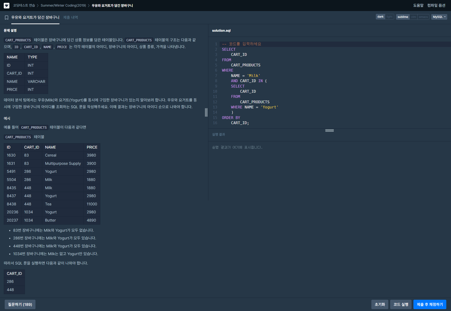 MySQL 우유와 요거트가 담긴 장바구니 정답입니다.